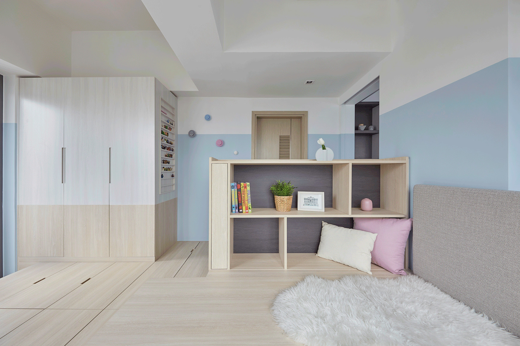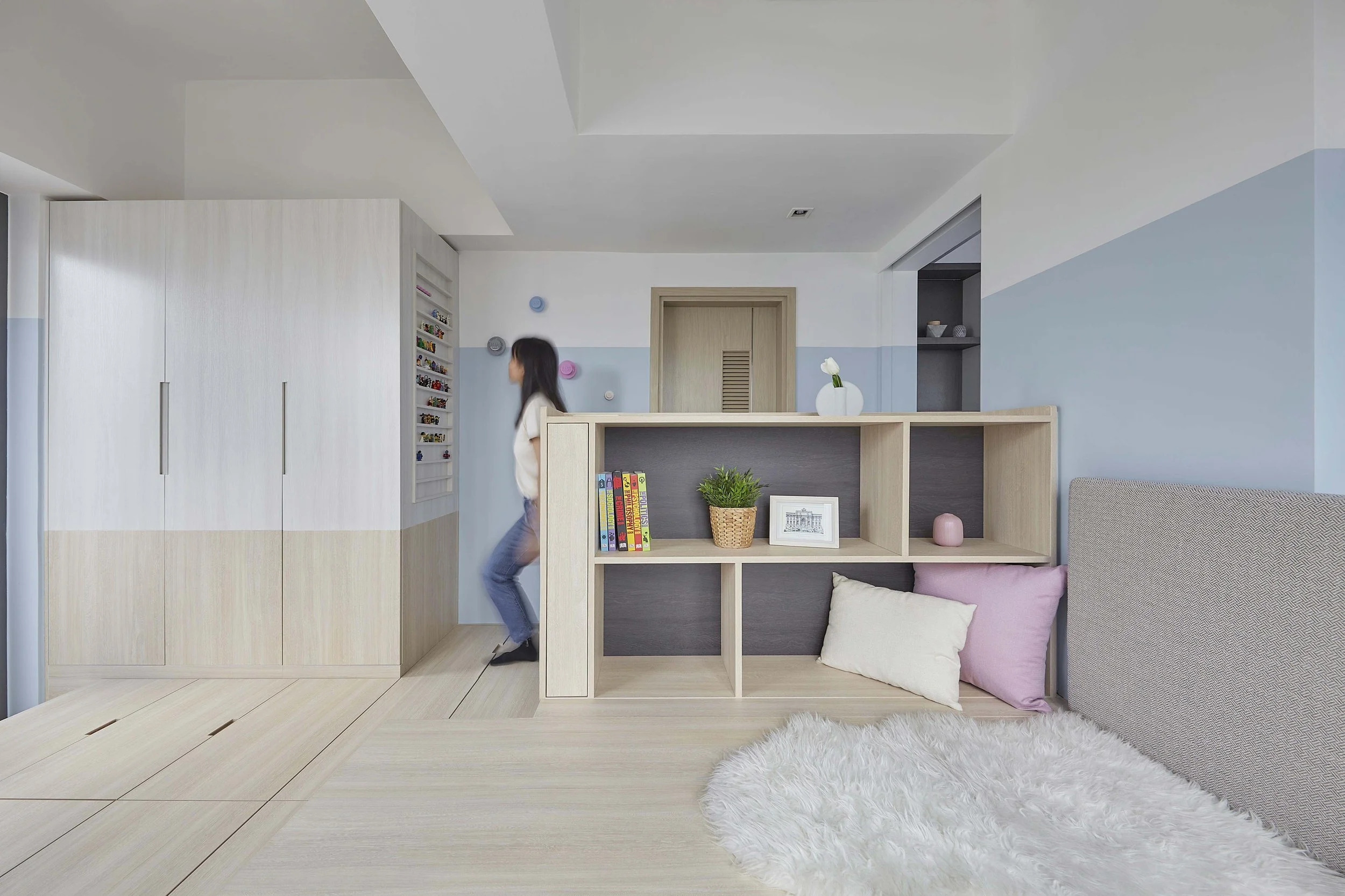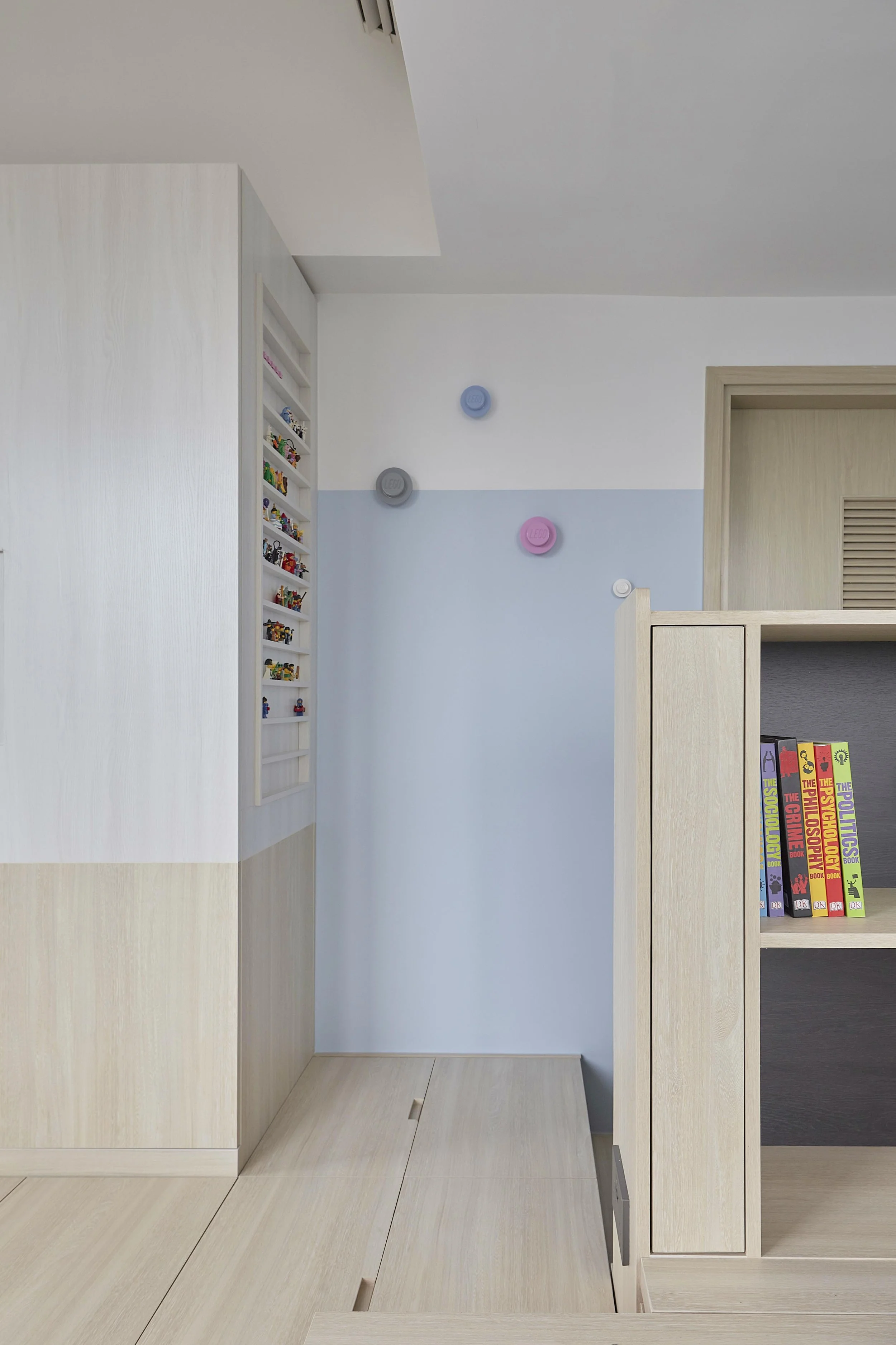 Sim-Plex considered integrating a layout that allows the display of Lego interests and drew inspiration from the bright and transparent techniques of Scandinavian design. They combined the two bedrooms and used a half-height storage cabinet as a divider between the bathroom and the master bed, while maintaining a sense of transparency. The cabinet facing the bathroom reserved a space for displaying the owners' prized multi-dimensional Lego art, while the hollow space on the side of the master bed could be used to store books or small boxes for Lego components, and the tabletop reserved space for electrical outlets. Due to the high ceiling height of the project, which is over three meters, a wooden platform was introduced to provide additional storage space. The side of the wardrobe also features small compartments where small Lego figurines can be placed.