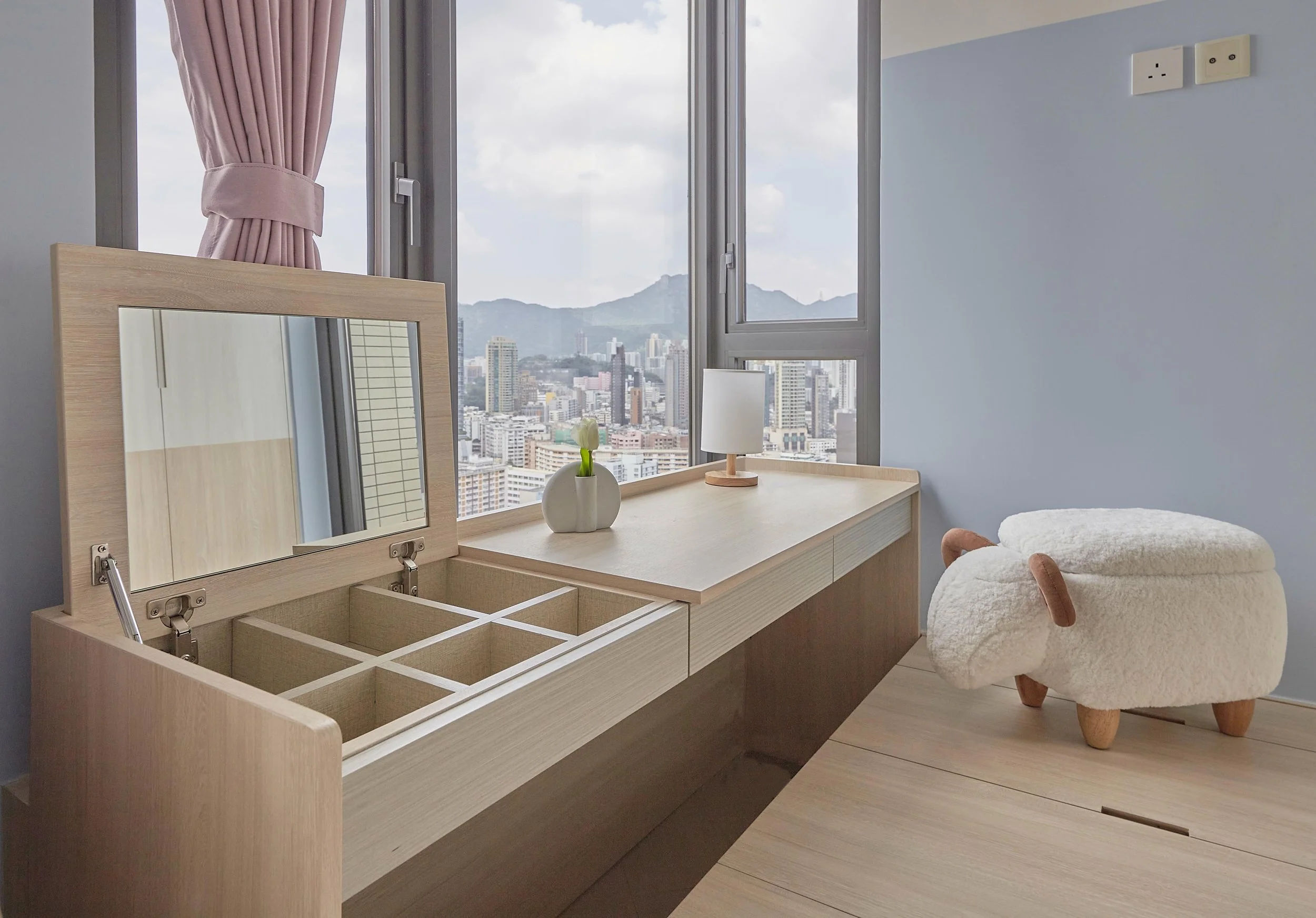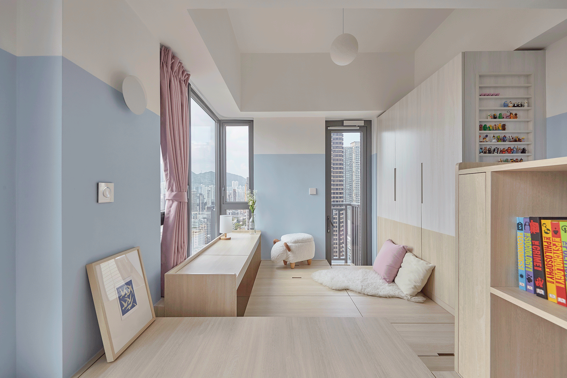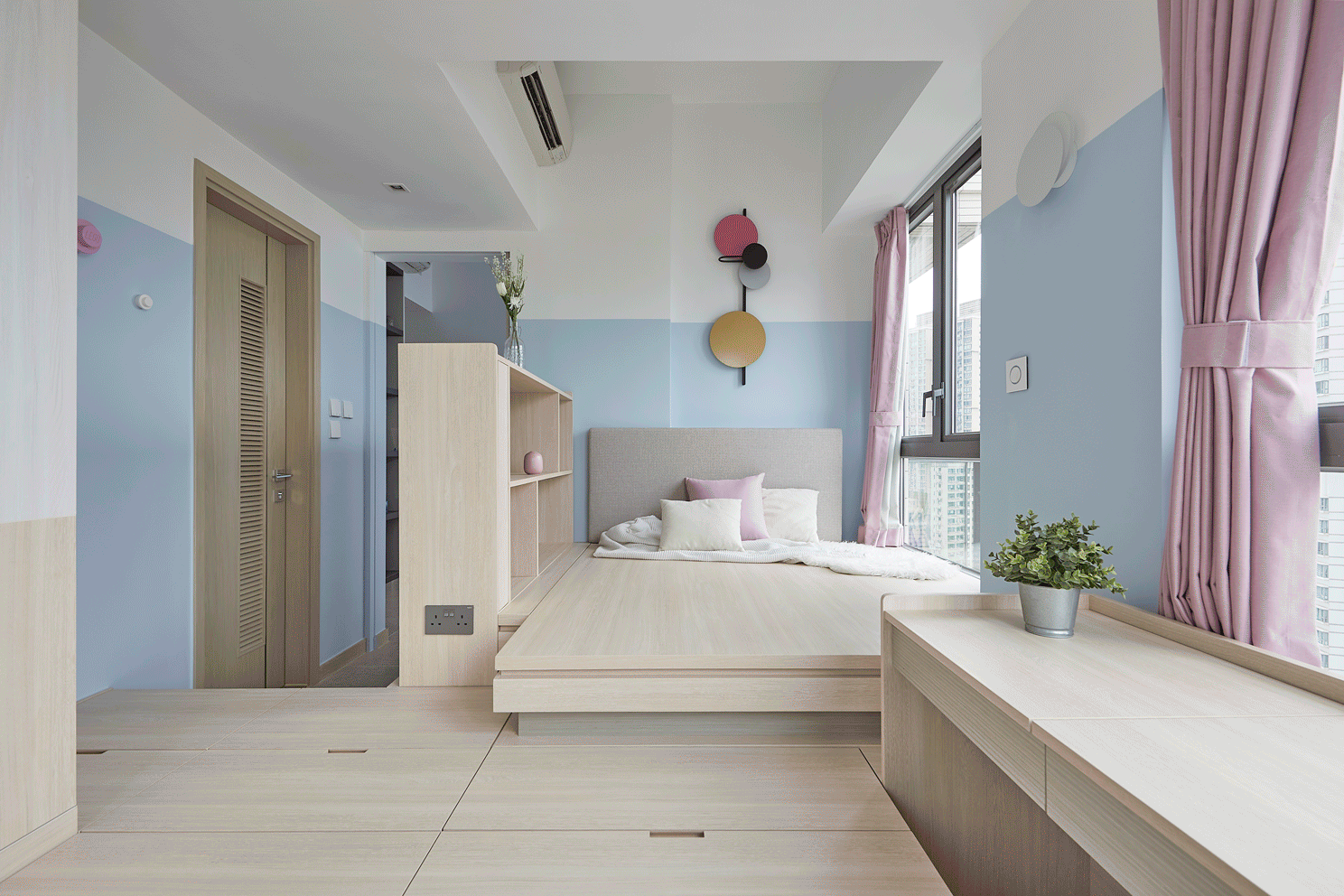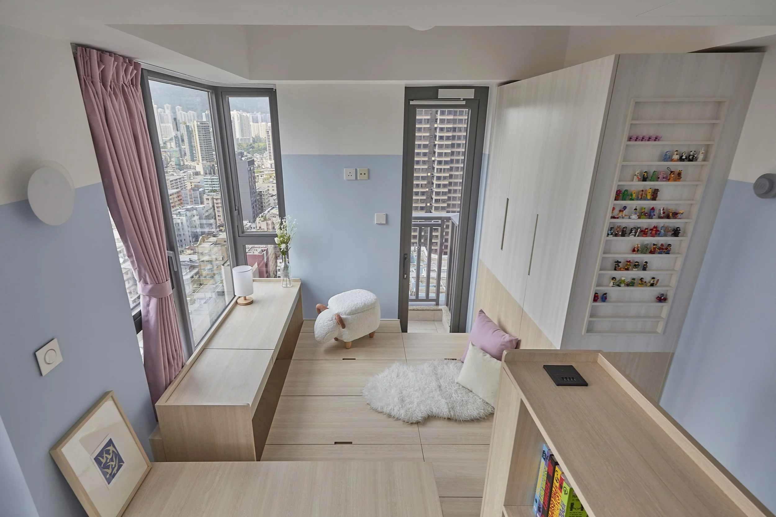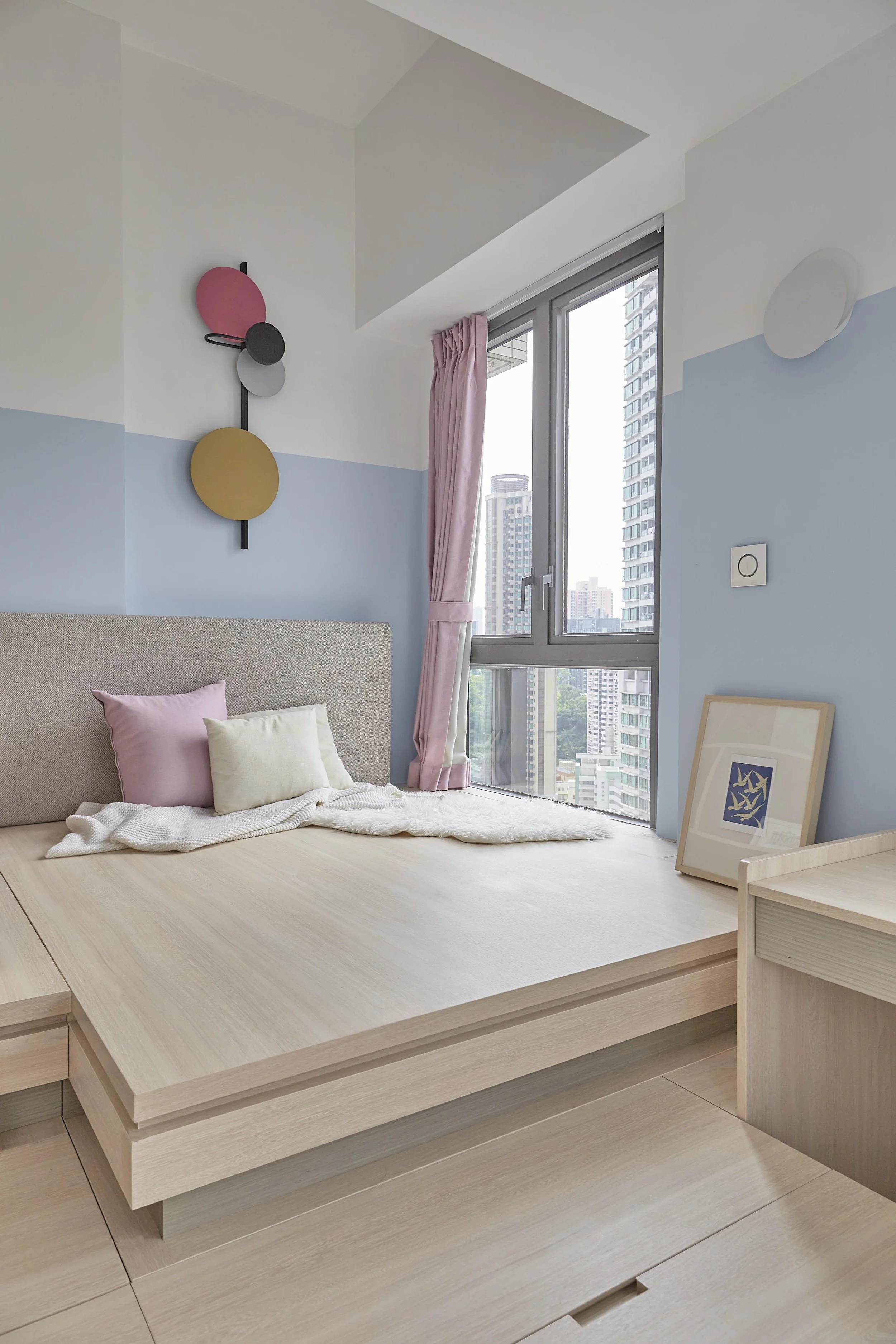 項目因樓底甚高,如配以全高的特色牆,則會更顯壓迫,Sim-Plex於是以上白下灰藍的分色手法貫通全屋,巧妙地增加空間特色但又不做成局促感,再加入粉色系的藝術點綴,如多面樂高藝術畫、梳化椅、主人房遮光窗簾、掛牆樂高裝飾及掛燈等,冷暖色的互相踫撞,展現出仿如置身於精品酒店的時尚感;主人房的窗旁亦設有長工作枱,有薄抽屜可放文具等,靠床那部分的枱面需要時可掀起,化身為梳妝枱,內藏鏡子及小格放化妝品;衣櫃掩門亦在內側藏有全身鏡方便換衣服時可用。精緻的色調踫撞及空間小機關,展現出仿如置身精品酒店的時尚感。