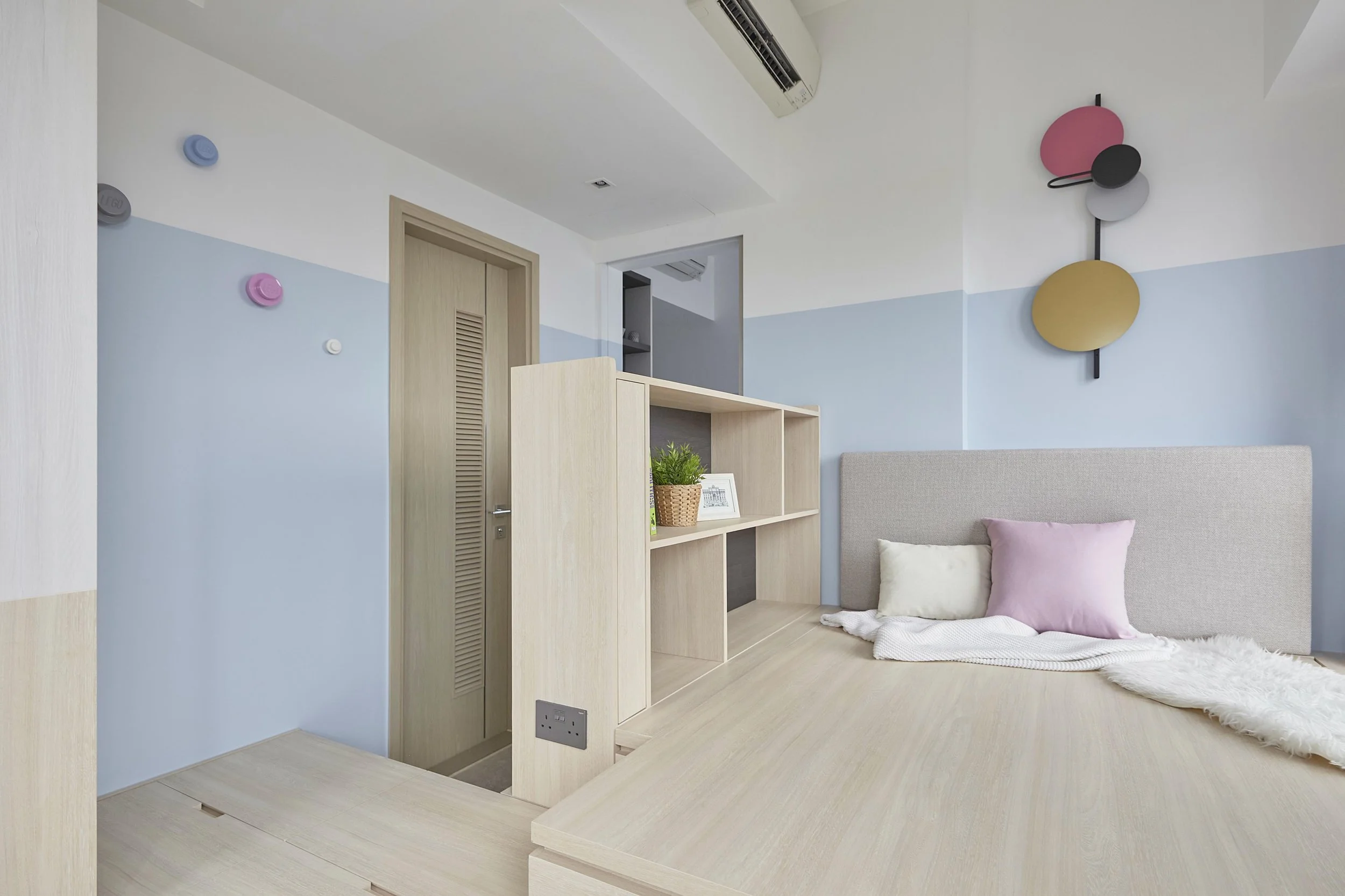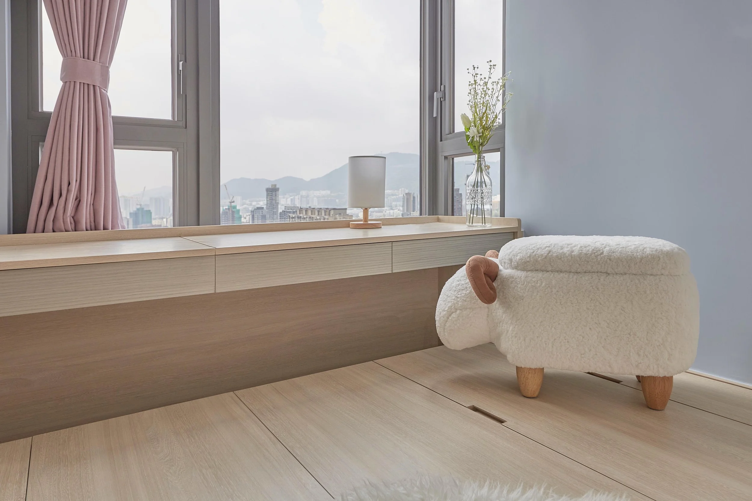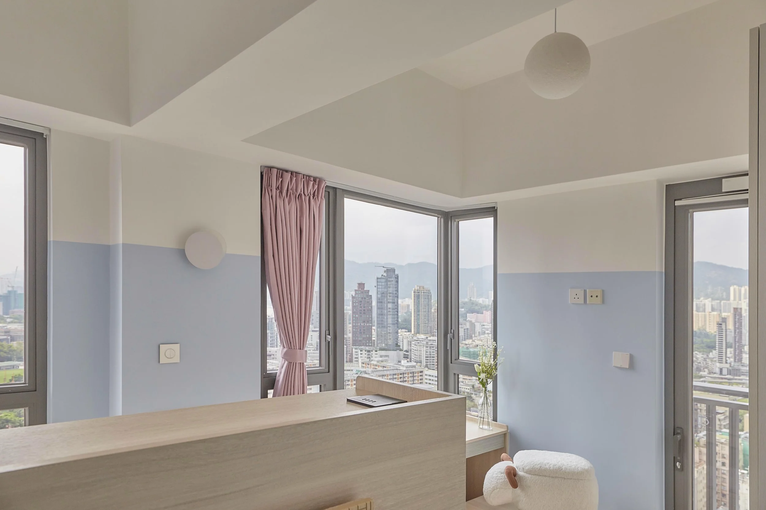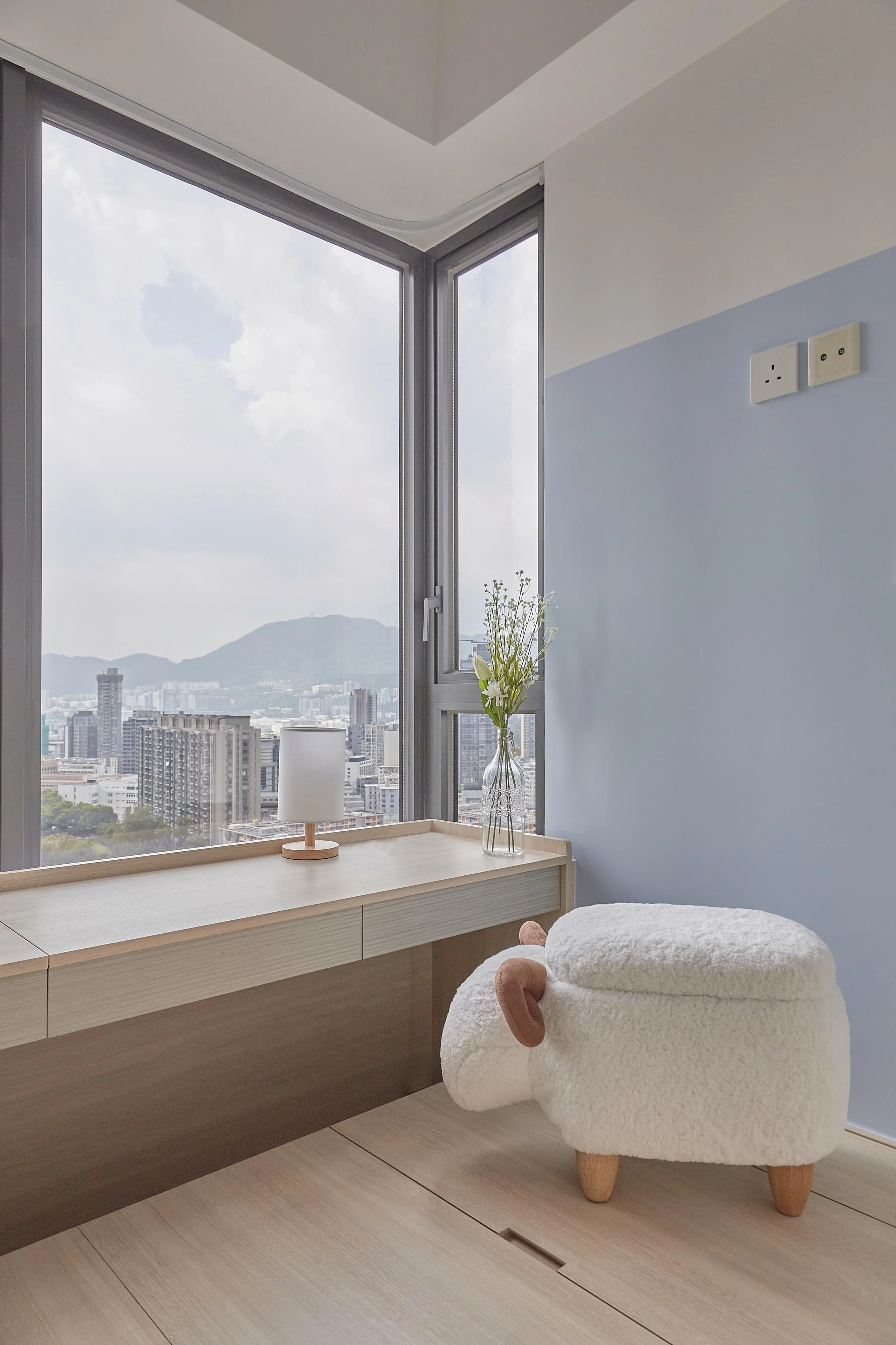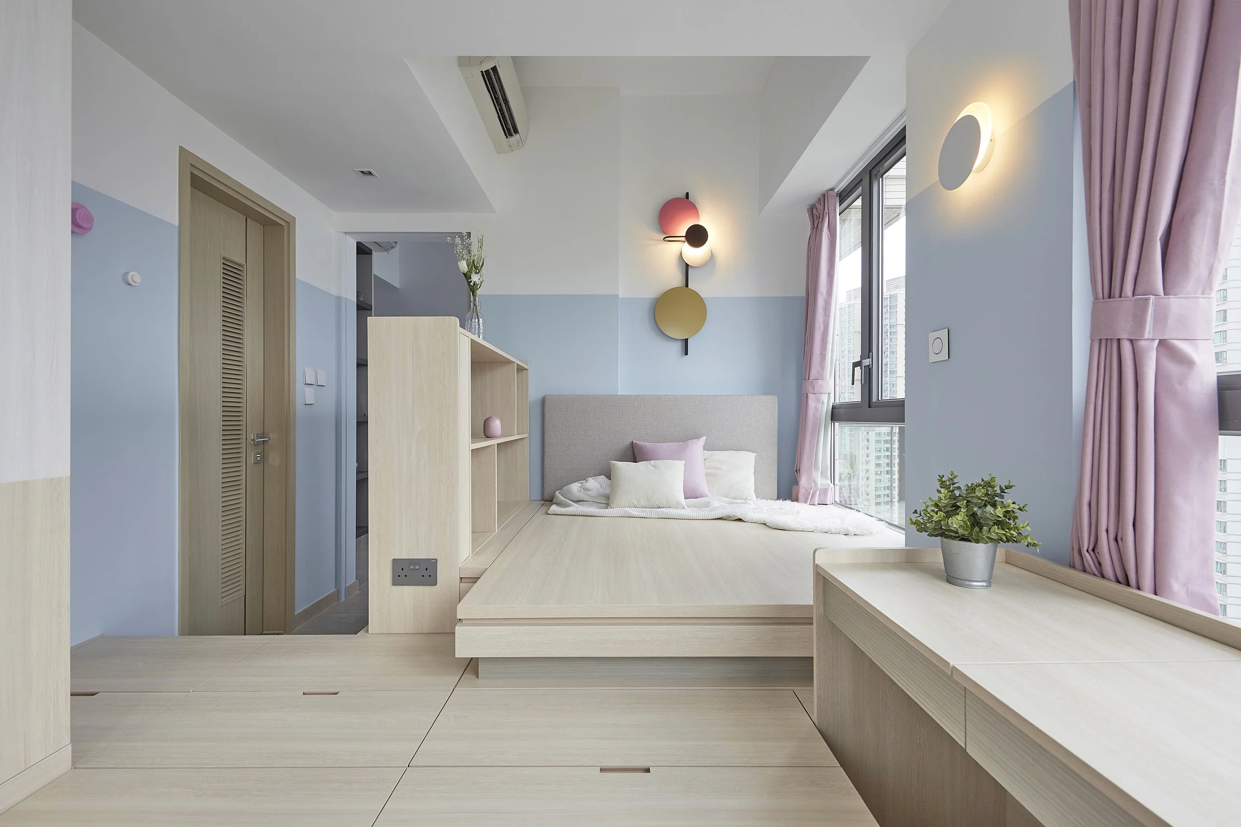 項目因樓底甚高,如配以全高的特色牆,則會更顯壓迫,Sim-Plex於是以上白下灰藍的分色手法貫通全屋,巧妙地增加空間特色但又不做成局促感,再加入粉色系的藝術點綴,如多面樂高藝術畫、梳化椅、主人房遮光窗簾、掛牆樂高裝飾及掛燈等,冷暖色的互相踫撞,展現出仿如置身於精品酒店的時尚感;主人房的窗旁亦設有長工作枱,有薄抽屜可放文具等,靠床那部分的枱面需要時可掀起,化身為梳妝枱,內藏鏡子及小格放化妝品;衣櫃掩門亦在內側藏有全身鏡方便換衣服時可用。精緻的色調踫撞及空間小機關,展現出仿如置身精品酒店的時尚感。