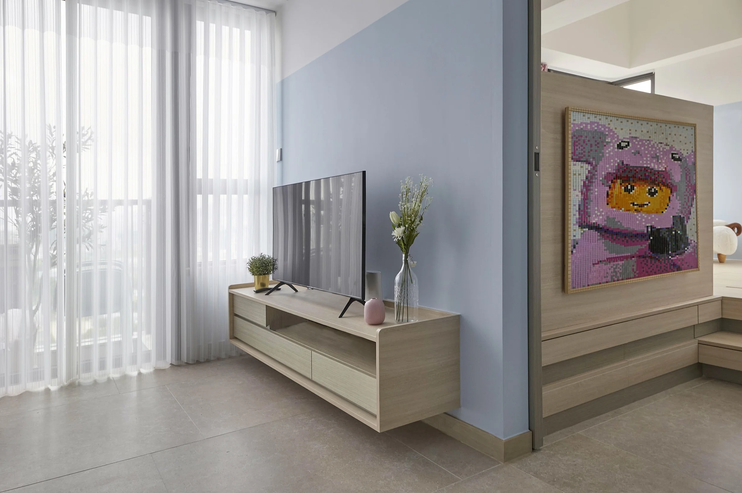 Due to the high ceiling of the project, if full-height feature walls were used, it would create a more oppressive feeling. Therefore, Sim-Plex employed a color scheme of white above and grey-blue below to create a sense of space without making it feel cramped. They added pink artistic accents, such as multi-dimensional Lego art, sofa chairs, blackout curtains in the master bedroom, Lego decorations and hanging lights, which collide with warm and cool colors, showcasing a fashionable feeling reminiscent of a boutique hotel. Next to the window in the master bedroom, a long work desk is provided, with slim drawers for stationery and other items. The tabletop near the bed can be lifted up when needed, transforming it into a dressing table with a hidden mirror and small compartments for cosmetics. The wardrobe doors also have full-length mirrors on the inside for convenient use when changing clothes. The exquisite color contrasts and small spatial mechanisms create a fashionable feeling as if being in a boutique hotel.