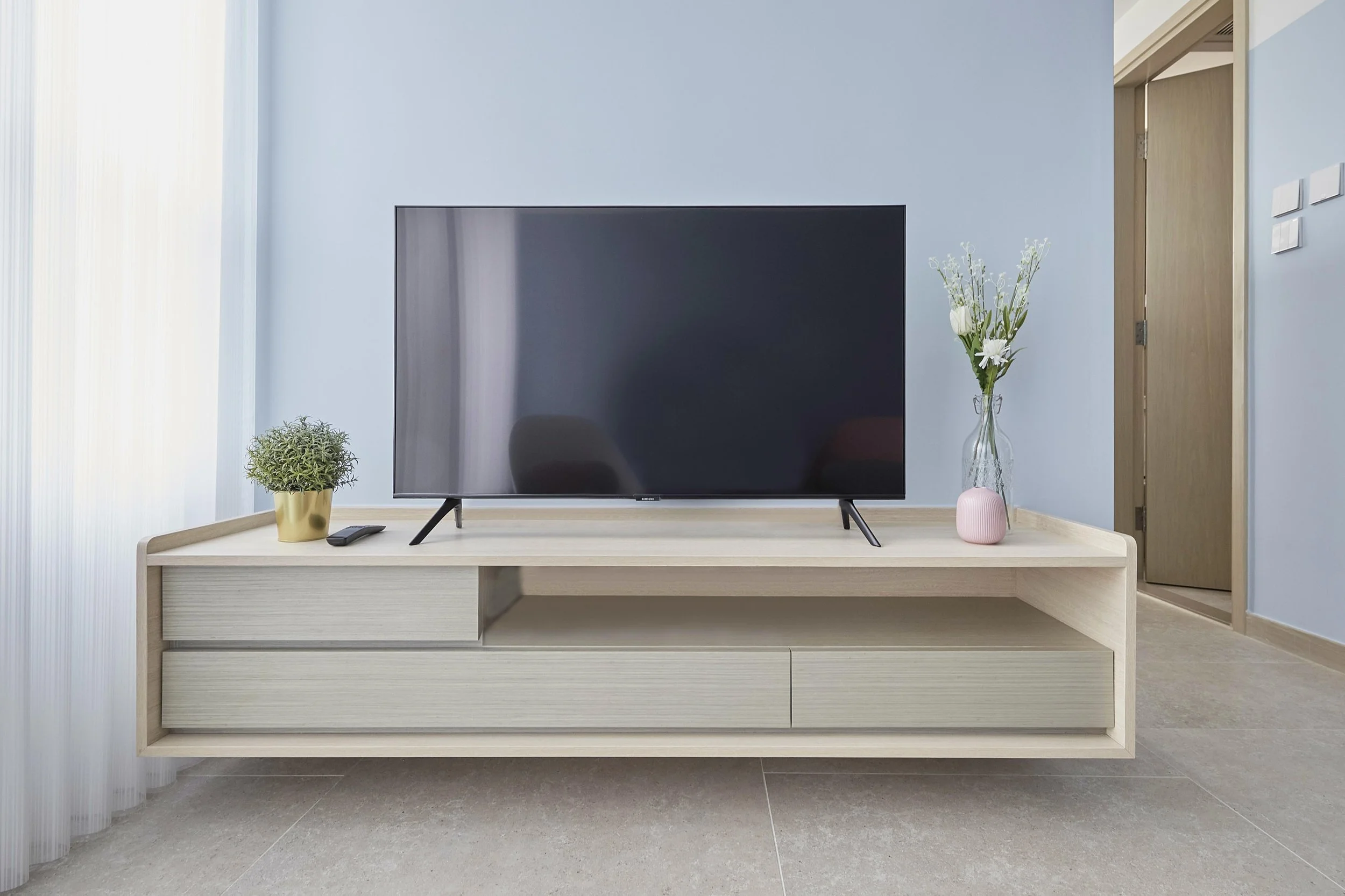 客廳則保留原先的開放式廚房,用木質的電視裝飾矮櫃襯托出圓潤自然的感覺,配上天花燈槽的射燈及白紗半透窗簾增加明亮感;主人房的門改為長虹玻璃趟門,保留私隱度之餘亦透進日光,打造出北歐的舒適明亮感。