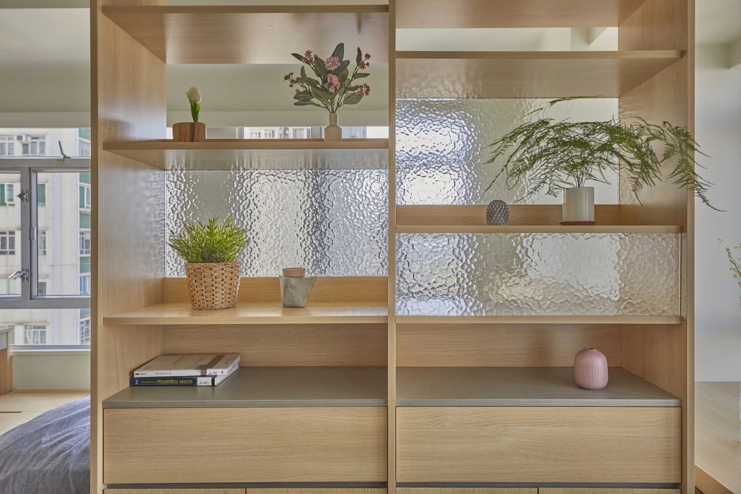 As a replacement for brick walls, the vertical plant shelves have a unique gradient design that becomes increasingly transparent from the bottom up: the bottom part consists of drawers and storage cabinets; the middle part utilises frosted glass with wave pattern, creating a semi-translucent effect that ideal for displaying decorative items and household goods without fully transparent; the top part is fully transparent and open at the top, allowing cross ventilation and the placement of potted plants. The greenery which undergo natural photosynthesis will help purify the air; the vertical shelves primarily use warm wood as the main material, accented with grey wood, blending with the wave glass to create a sense of intertwining solid and void; the living room activity area is also equipped with a ceiling fan to further enhance air ventilation.